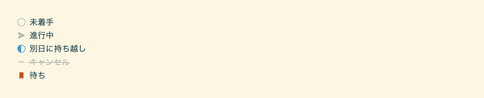 [ ]未着手[>]進行中[/]別日に持ち越し[-]キャンセル[b]🆕 待ち- レビュー待ちなど、自分ではそのタスクが進められない状態になった時に使う