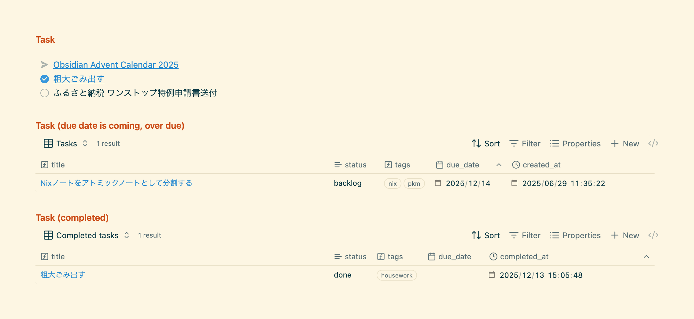 🆕 Daily note に Bases のテーブルを表示し、締切が近いタスク、その日に完了したタスクを表示するようにした。 期限が近い(3日以内)のみ完了タスクと、その日に完了したタスクを抽出している。 見る頻度は Dashboard よりもこちらの方が高い。