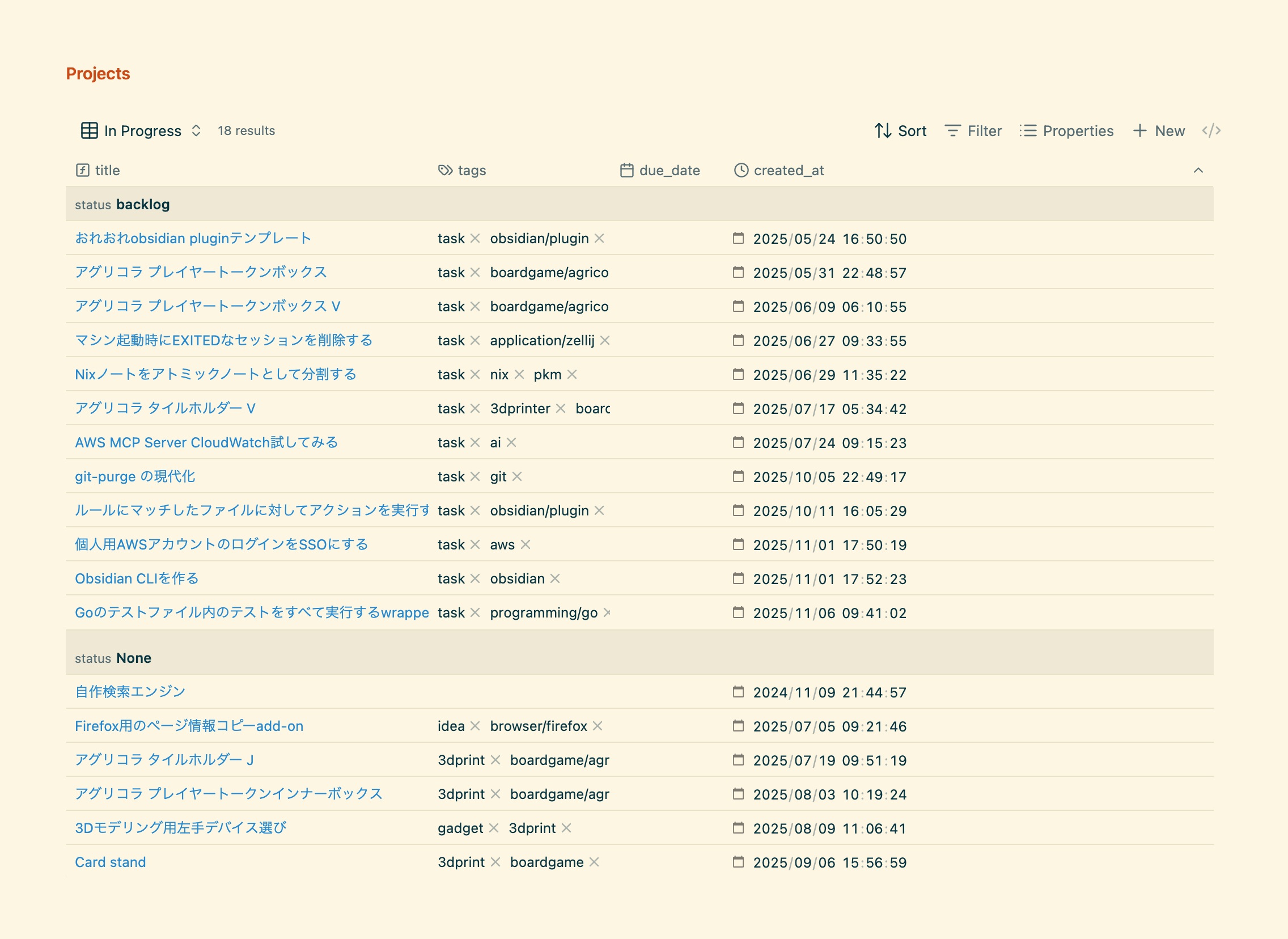 🆕 Dataview ではなく、Bases を使うようになった。 公式機能なので今後のサポートも安定しているだろうというのと、自分の使い方であれば Bases の機能で十分だろうという判断から(単に新しい機能を使いたかったというのもある)。 Dashboard 用のノートを作り、そこで一覧できるようにしている。