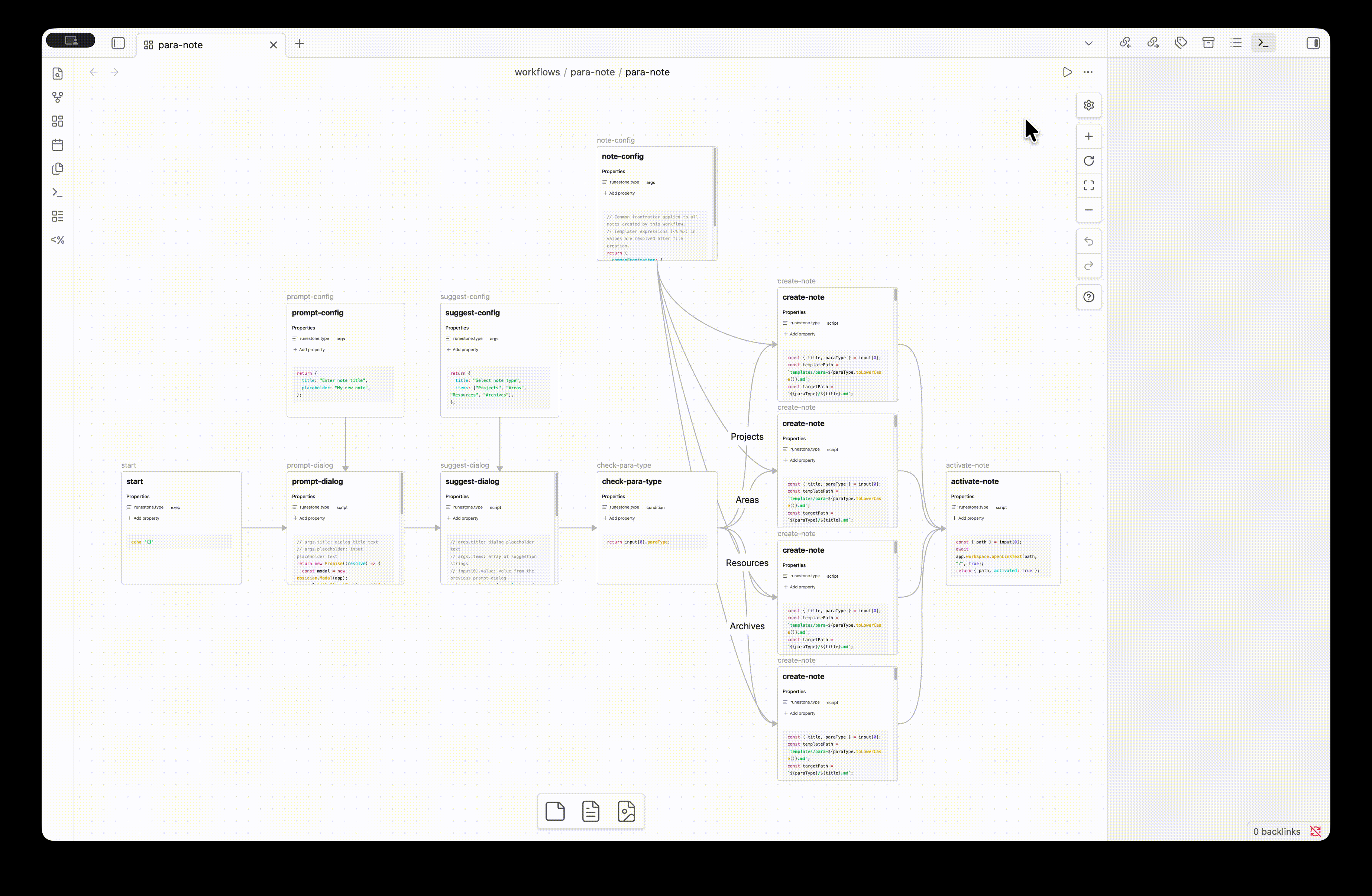 n8n のような本格的なワークフローエンジンと比べれば機能は限定的だが、Obsidian 内の操作を定義・可視化するには十分だろう。